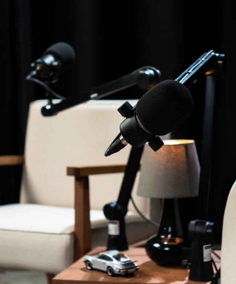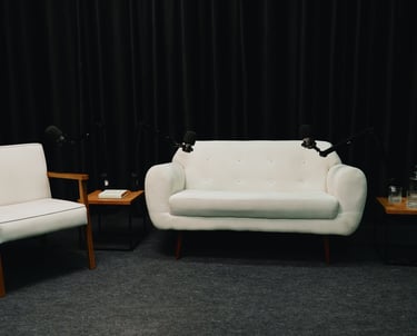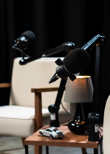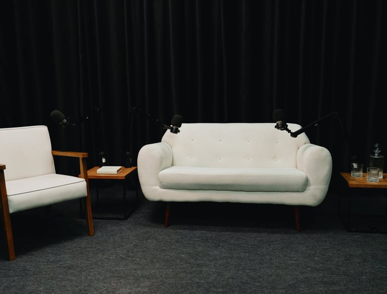 Mesa equipada para gravações de podcasts com qualidade profissional e conforto para os participantes.