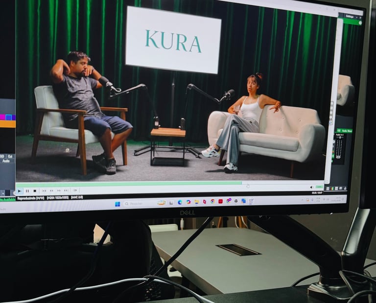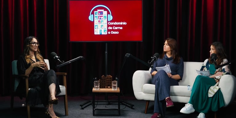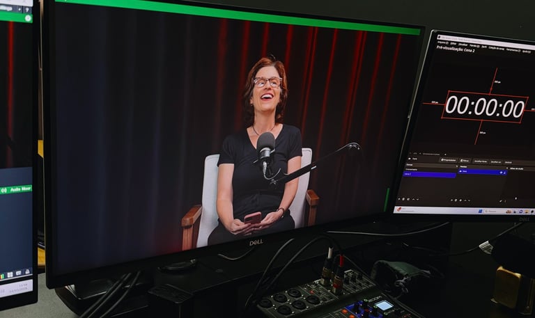 Nosso estúdio no Morumbi é perfeito para gravar podcasts com som claro e ambiente confortável.