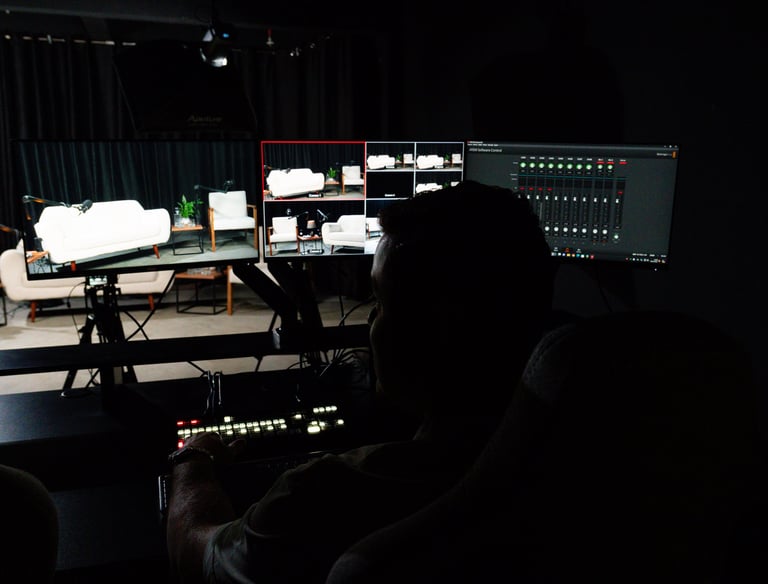 Ambientes preparados para gravações com fundo removível, ideal para produções audiovisuais criativas.